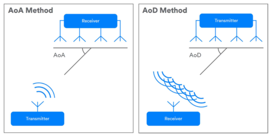 最新藍牙標準(5.1)允許系統(tǒng)使用天線陣列來確定通信方向(圖3)。使用天線陣列的單個設(shè)備可以與任何其他藍牙設(shè)備一起確定彼此的相對方向。這是通過測量到達角(AoA)或離開角(AoD),這取決于通信的方向和哪個設(shè)備有天線陣列。